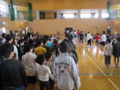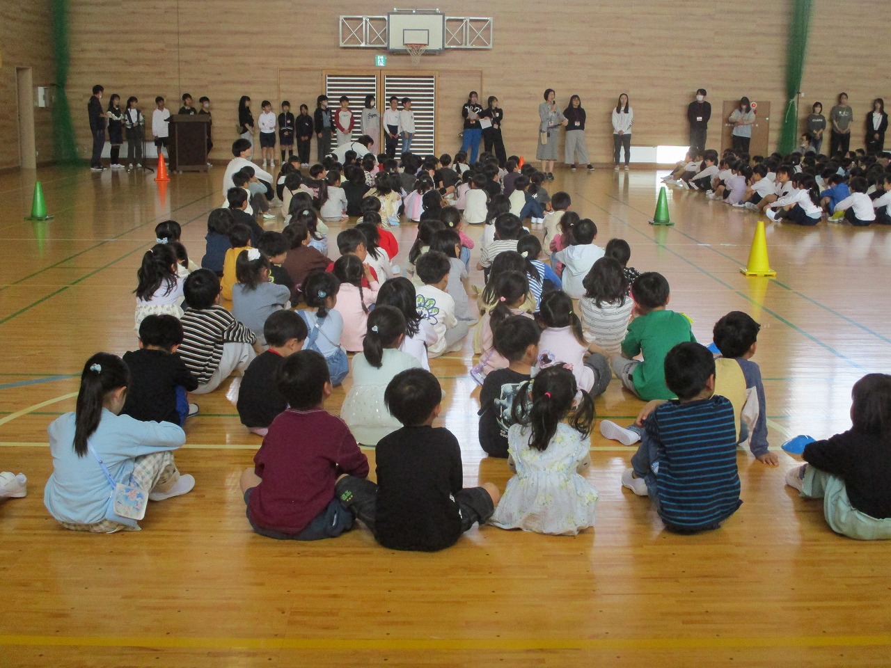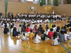 校歌を歌ったり、2年生から6年生が朝日小学校での楽しいこと教えてくれたり、