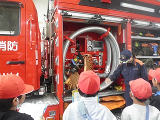 消防車には、ホースやライト、ロープなどたくさんのものが積んでありました。