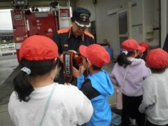 消防署の人が現場に行くときに背負う、ボンベを持たせてもらいました。20kgあり、子どもたちは「ランドセルより重たい」と言っていました。