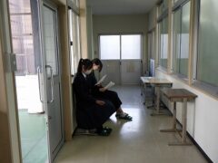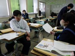 教室で順番を待つ間も、友だちと熱心に練習する姿が見られました。