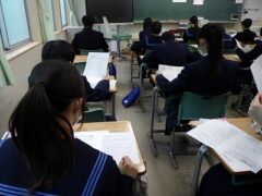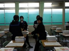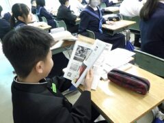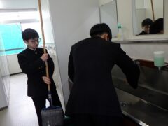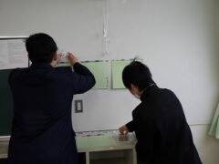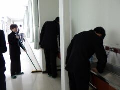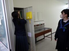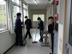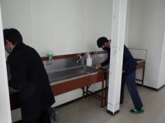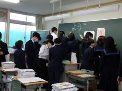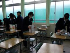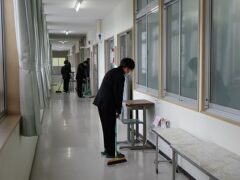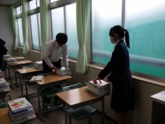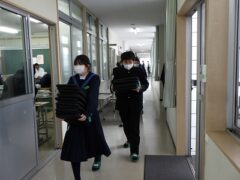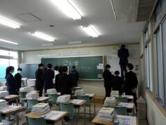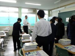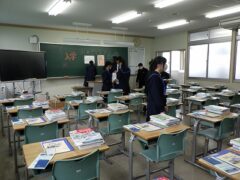 教室、廊下などの清掃、そして、教科書やたくさんの配り物を新入生の机の上に整えて置いていきます。