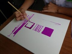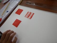 美術の授業では、絵具を使って、塗り方の学習をしています。