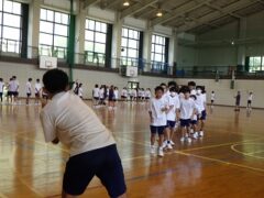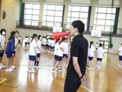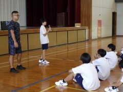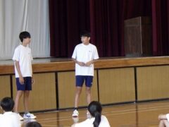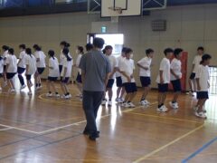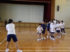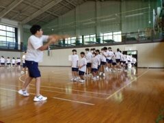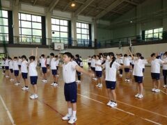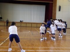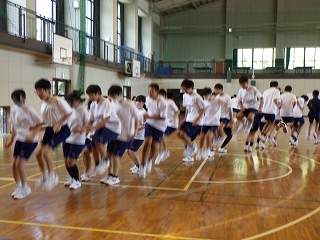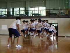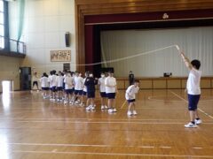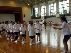 3限目の学活では、体育館で全員リレーの入場隊形、ラジオ体操、大縄跳びの練習をしました。