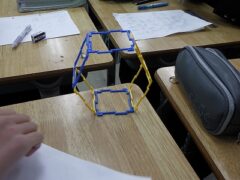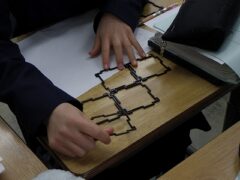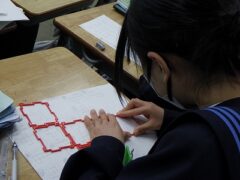 2組は数学で、立方体の展開図の学習です。グループで相談して、11種類の展開を見つける課題が出されています。