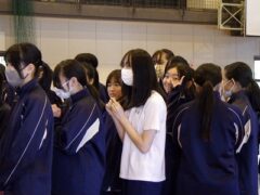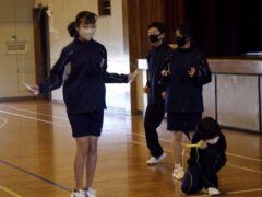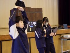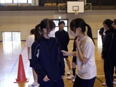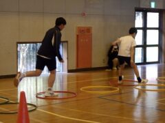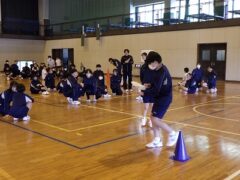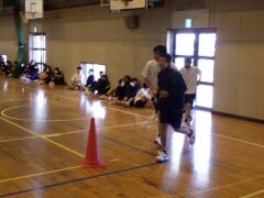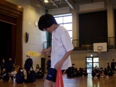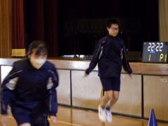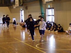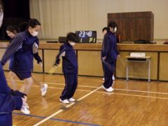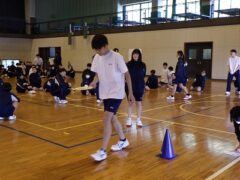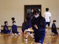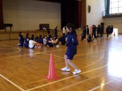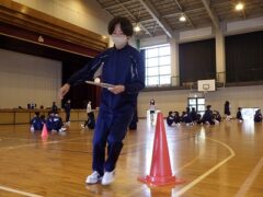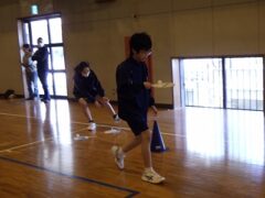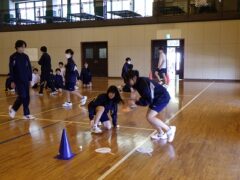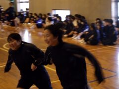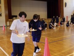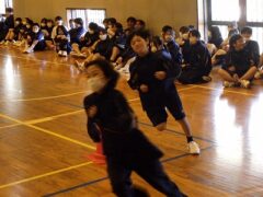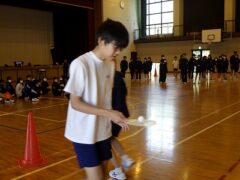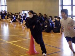 3つ目は、クラス対抗障害物リレーです。縄跳び、けんけんぱ、ボール挟み跳び、ピンポン玉うちわ運びで競走です。