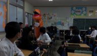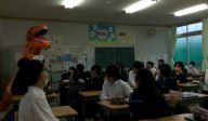 2年生の廊下に、仮想した何かがやってきました♬どのクラスも大はしゃぎ😊