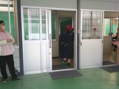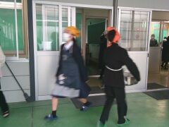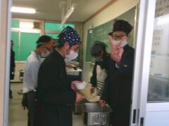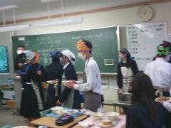 当番は、手早くエプロン、三角巾(帽子)、マスクをつけて配膳準備をします。