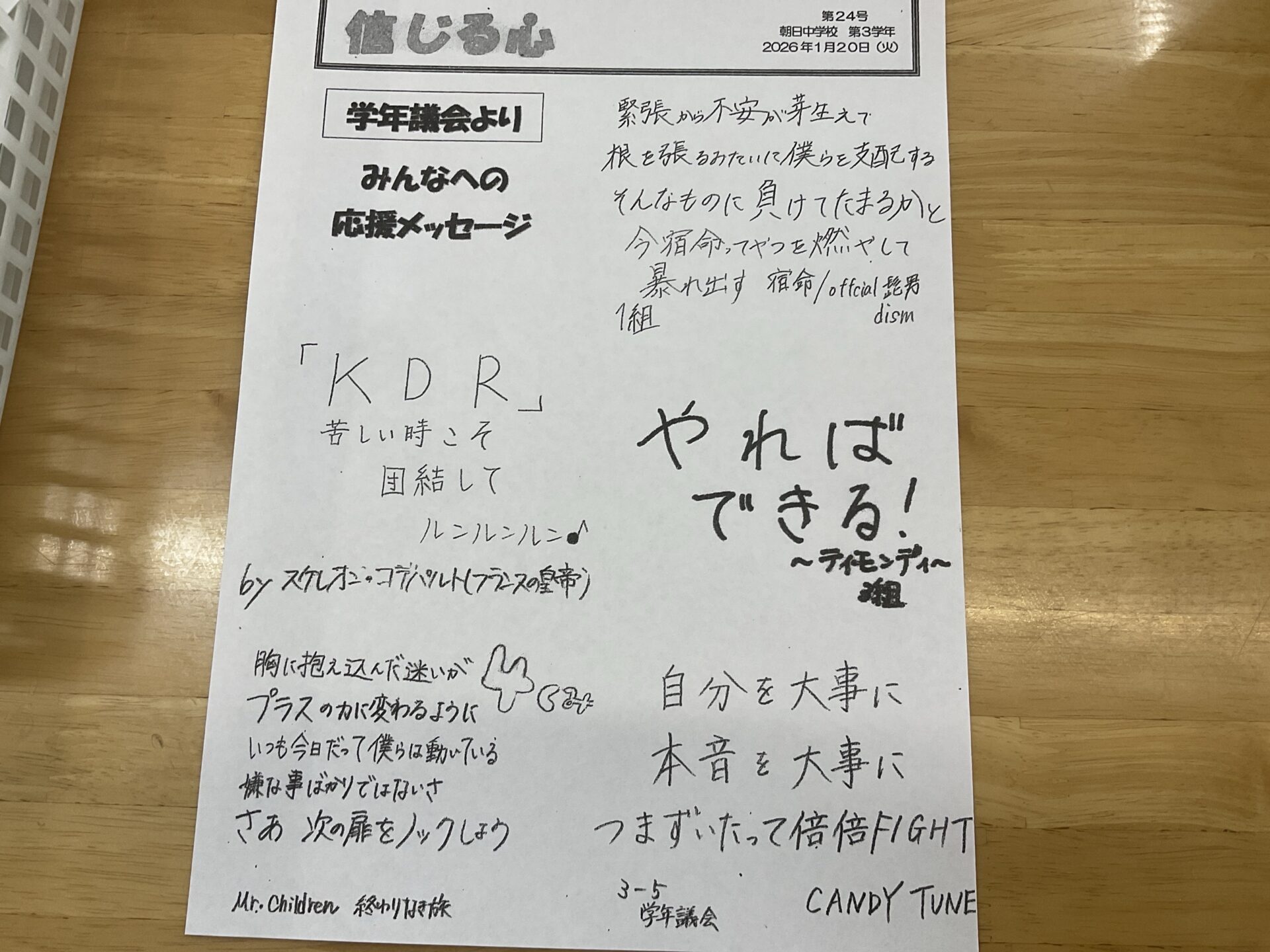 そこで、学年議会として学年全体にエールを送るため、学年議会のメンバーが皆さんを励ます学年通信を書きました。